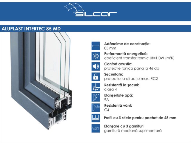 Aluplast Intertec 85 è un sistema premium a 7 camere per il telaio e 6 camere per la sbarra, con una profondità costruttiva di 85 mm e 3 guarnizioni di tenuta.