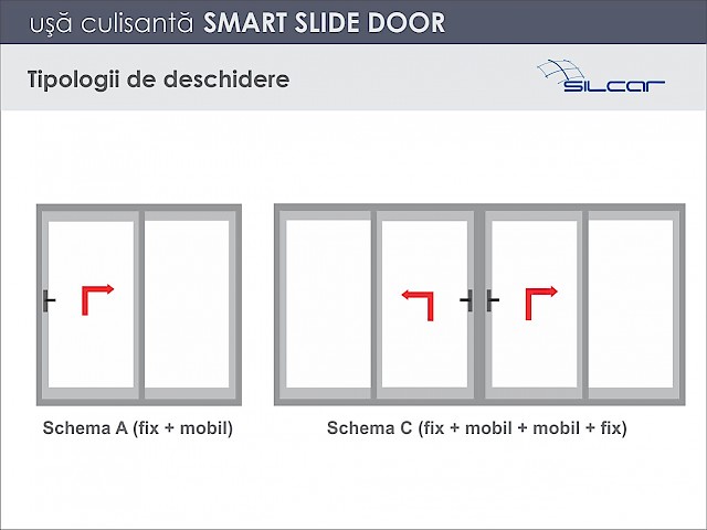 L'uso delle porte scorrevoli smart-slide rappresenta un passo avanti nell'ottimizzazione dello spazio interno della stanza, poiché l'apertura della porta non richiede che il battente mobile esca dal piano. La porta smart-slide può essere realizzata nelle configurazioni A e C.