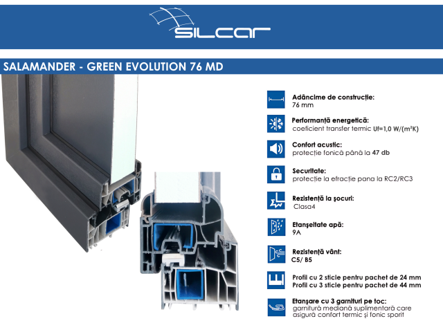 Con una profondità di installazione di 76 mm, 6 camere e 3 guarnizioni, i profili garantiscono un'eccellente isolamento termico e acustico, rispettando gli standard RAL e risultando ideali per progetti ad alta efficienza energetica.