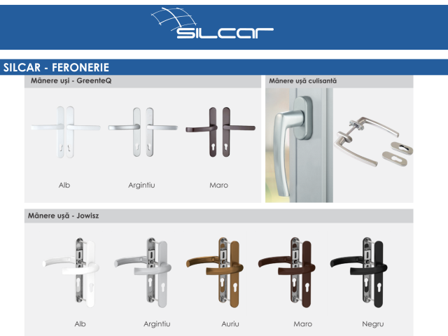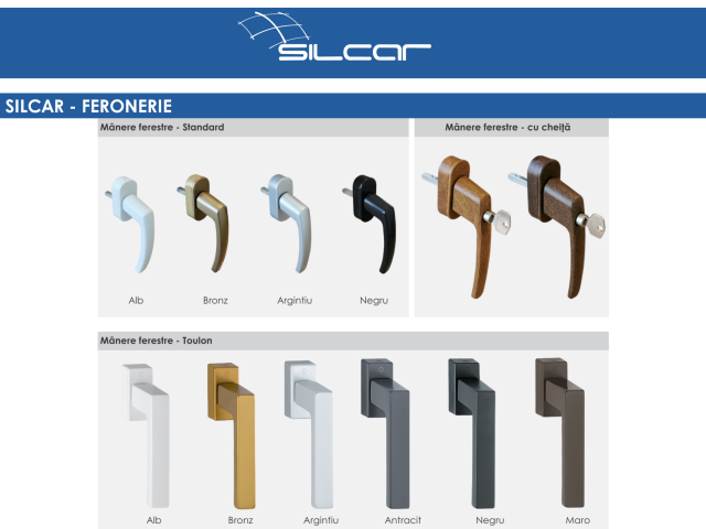 Feroneria asigura functionalitatea ferestrei. De aceea ea reprezinta o alegere extrem de importanta. Feroneriile ce echipeaza ferestrele Silcar contin in standard piese pentru contra-actionare gresita si microventilatie. In functie de gradul de siguranta cerut, acestea pot satisface standardul RC1 - RC2(WK1) si RC2( WK1 si WK2)