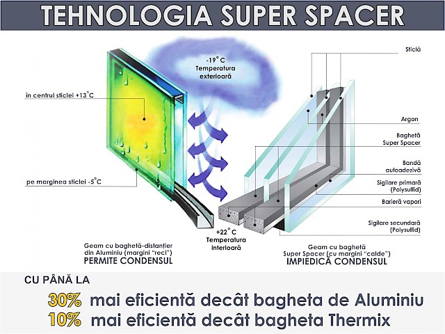 ✔ Prevenirea condensului perimetral: Utilizarea baghetei Super Spacer poate reduce condensul pe marginea geamului cu aproximativ 70% fata de baghetele de aluminiu, prevenind astfel aparitia mucegaiului si a altor probleme asociate umiditatii.