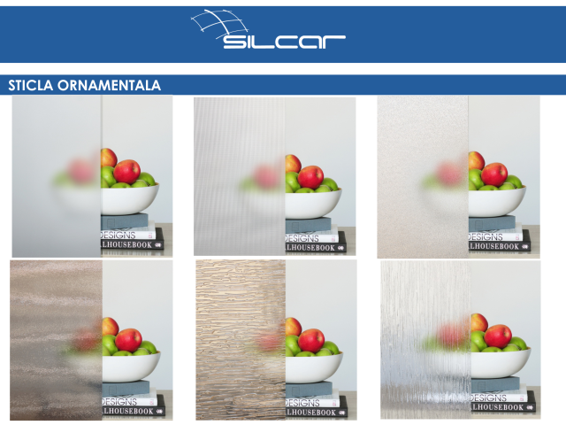 ╰┈➤ Sticla ornamentala este un tip de sticla decorativa folosita in diverse aplicatii arhitecturale si de design interior. Aceasta este disponibila in diferite texturi, modele si finisaje, avand rol atat estetic, cat si functional. Sticla ornamentala poate fi folosita pentru a crea diviziuni intre incaperi, usi de interior, pereti sau panouri decorative.