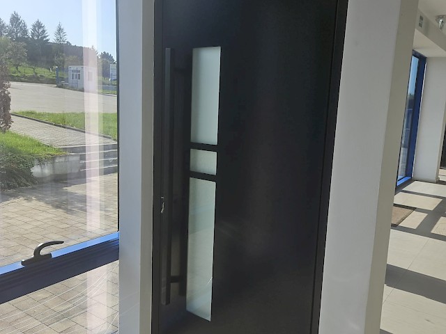 Constructia se bazeaza pe sisteme de profil din aluminiu cu termo izolare MB-86N, cea mai avansata tehnologie de sisteme de usi prezenta in oferta ALUPROF. Profilul foii de usa este adaptat pentru realizarea de umpleri speciale, unit din partea interioara cu cerceveaua.